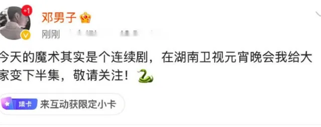 而鄧男子卻在節目後表示「今天的魔術其實是個連續劇,在湖南衛視元宵晚會我會給大家變下半集了,敬請關註!」