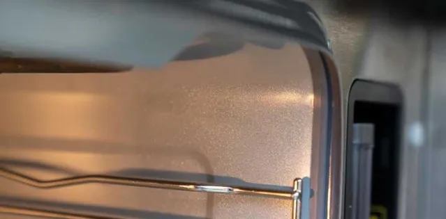 值得一提的是,與普通不銹鋼腔體的烤箱不同,方太整合烹飪中心蒸烤烹飪機內壁采用了瓷膜工藝,不易沾油汙,用後清潔更容易。在燈光照射下,可以清晰的看到,內壁泛著類似於珠光的小光點,摸起來也相當順滑。