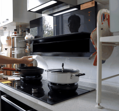 在烹飪結束關火後,煙機還會持續執行2分鐘充分排除油煙、蒸汽。可以清晰的看到,鍋內散發的熱氣完全被煙機吸走。