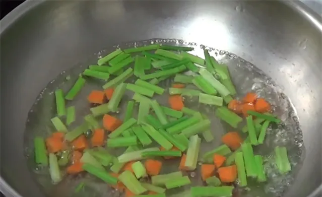 4.另起鍋加水,水開後把芹菜和胡蘿蔔下鍋,水再次燒開,煮五分鐘就可以撈出,芹菜、胡蘿蔔和黃豆都放涼。