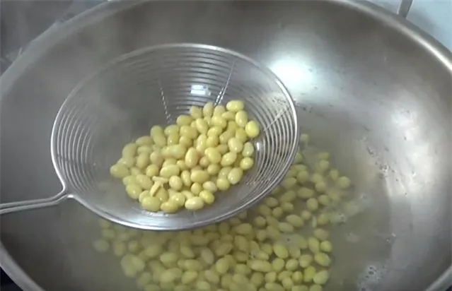 3.然後起鍋加水,水開後把黃豆下鍋,水再次燒開後煮五分鐘,黃豆就可以撈出了,黃豆撈出後用涼水沖洗一下,然後放涼備用。