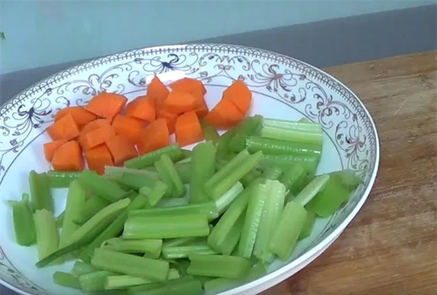 2.再準備洗凈的芹菜和胡蘿蔔,然後把芹菜切段,切好後裝盤備用,再取一小塊胡蘿蔔切成丁,同樣裝盤備用。