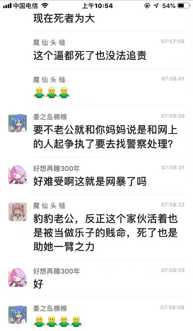 離奇的是施暴者在微博一邊可憐兮兮地說自己知道錯了、對不起死者,一邊和小團體討論怎麽裝可憐怎麽逃避責任,先是假裝吞藥,再是假裝自己已自首,最後選擇銷號跑路,還要在小團體裏說「我幹嘛要為她負責?」……好像這個永遠停留在18歲的少女的死和她一點關系都沒有。