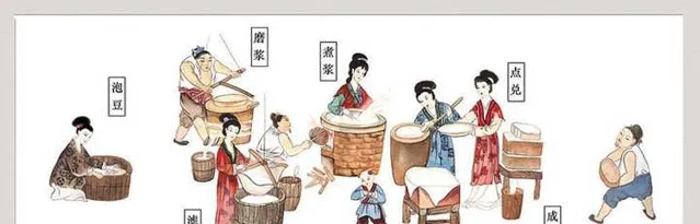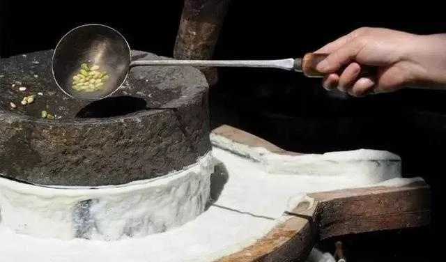 記憶裏,太婆總是不慌不忙地往磨裏倒上一勺泡好的豆子,再搖著磨,不多時就淌出了乳白色的豆沫(豆渣、豆漿和泡沫的混合物)……