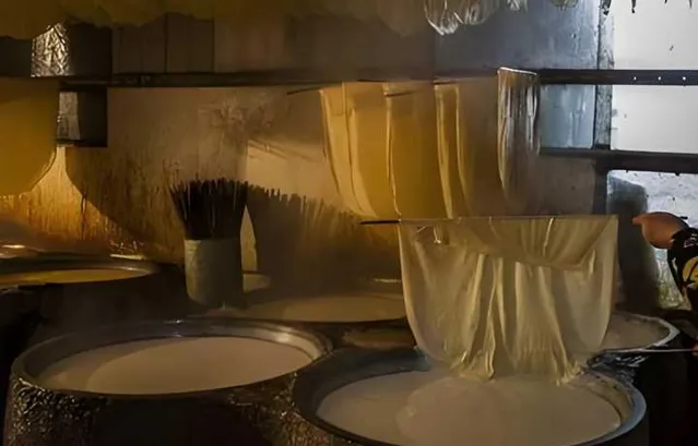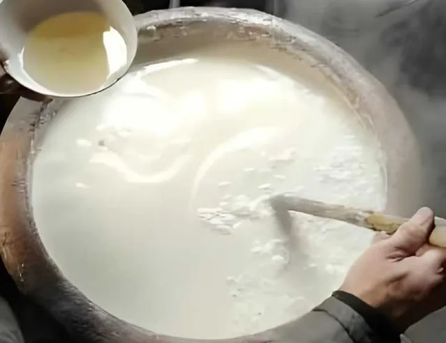挑完豆腐皮,就可以點鹵了。太婆總少不了念幾句,「要一滴一滴慢慢地倒進勺子裏,再用勺子在豆漿裏攪拌均勻」……豆漿也漸漸「開花」(變成絮狀)、變粘稠,直到一根筷子插進去、能夠立起來並且稍稍有些傾斜的時候,豆腐就點好了。