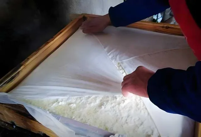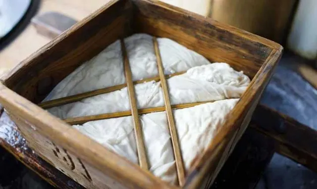 豆腐點好了,要用炊巾鋪在容器裏(方言裏的「豆腐格」),把點好的豆腐舀進豆腐格裏,再加上重物壓在上面,讓水分充分析出。
