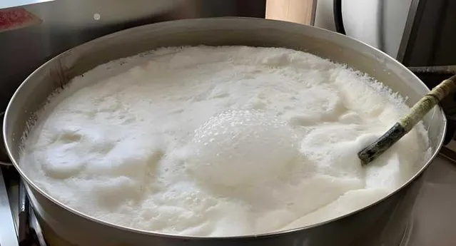 這個時候的豆漿是生的,還要在鍋裏煮開。火不能大,要是燒滾了「pu」(方言指液體沸騰後溢位來)出來,就會影響豆腐的產量了。