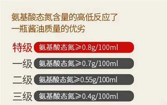 這個是醬油最核心的指標,這個標準是發酵程度的一個指標,發酵時間越長,豆的蛋白質分解的胺基酸也就越多,鮮味也就越足,證明醬油的品質也越好,有些醬油宣傳自己「足釀180天」,就是這個理由。